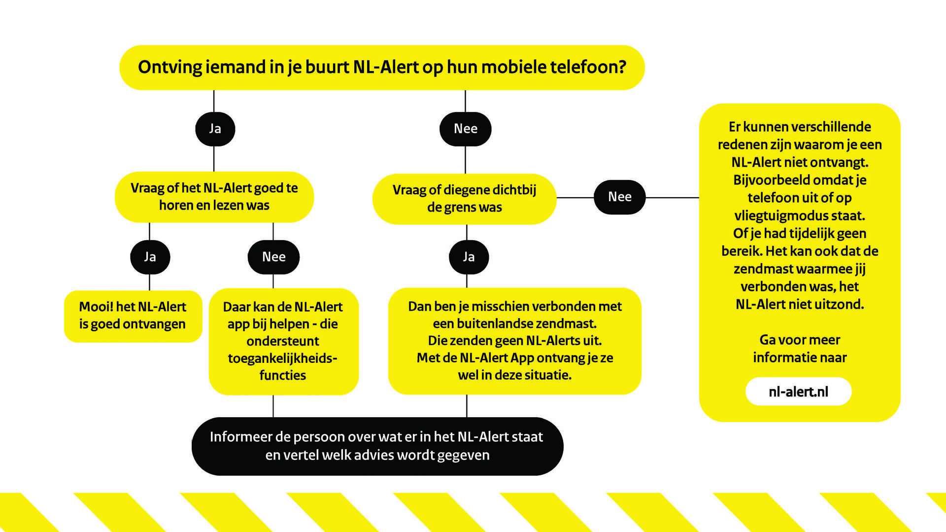 Heeft iemand in je buurt het NL-Alert niet ontvangen? Daar kunnen verschillende redenen voor zijn. Het kan ook zijn dat een NL-Alert niet duidelijk was. Zo zorg jij dat iemand op de hoogte is én het volgende NL-Alert ontvangt: |
