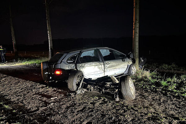Een auto schramde na het rijden door een diepe plas een boom waarna hij met de voorkant tegen een andere boom tot stilstand kwam. De 4 inzittenden konden zelf het voertuig verlaten, 1 persoon heeft lichte verwondingen ondervonden. Er kwam geen ambulance ter plaatste. De auto liep behoorlijke schade op, onder andere de achteras bevond zich naast het voertuig.